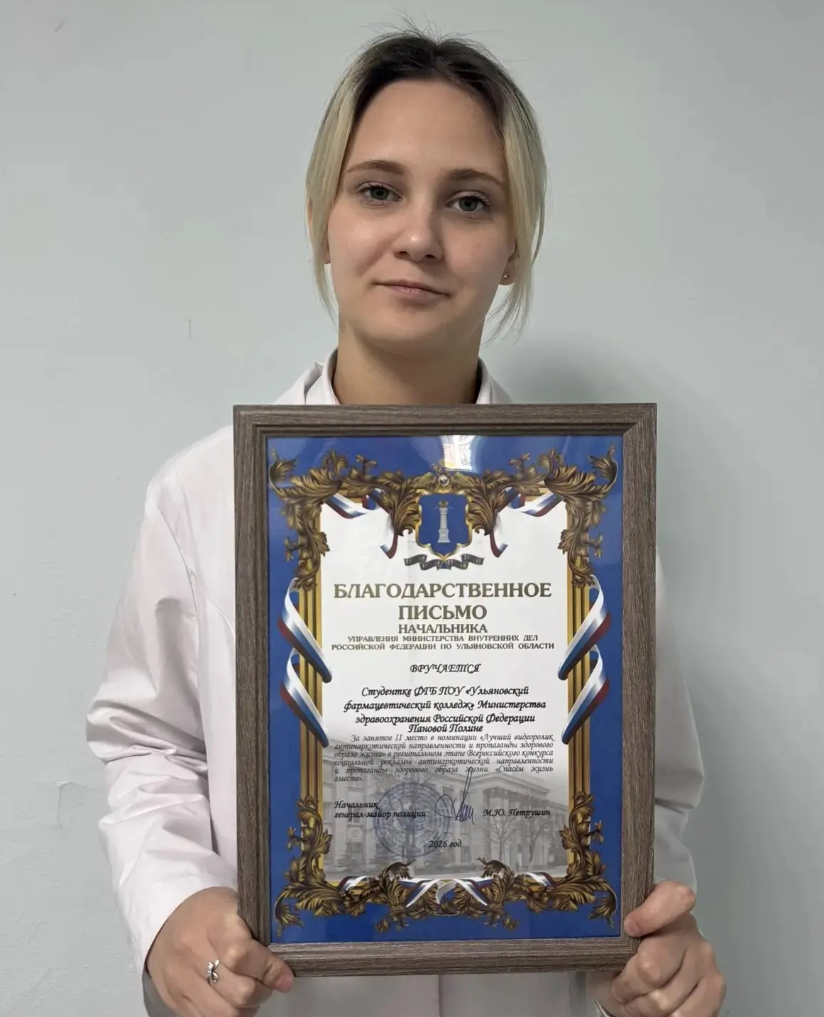 Студентка нашего колледжа, Панова Полина, получила официальное благодарственное письмо от Управления Министерства внутренних дел по Ульяновской области.