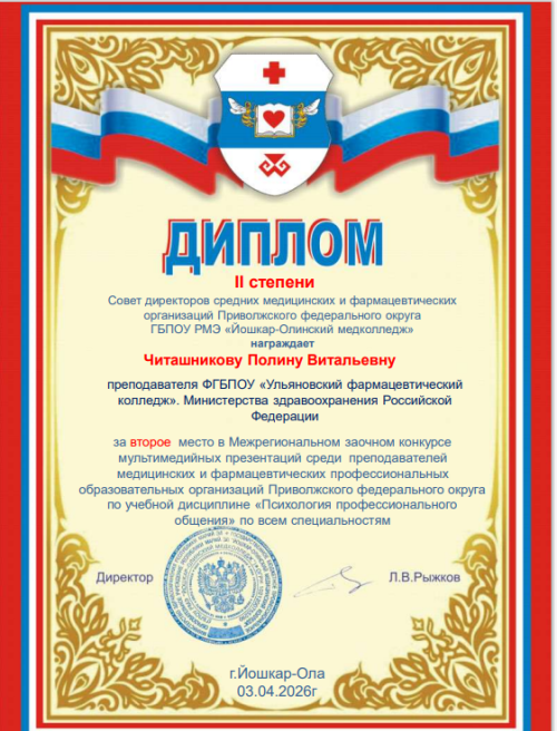Поздравляем студентку Гимадееву Викторию и преподавателя Рамзайцеву Наталью Викторовну с занятым 1 местом во Всероссийской он-лайн олимпиаде по МП. 04 Проведение лабораторных микробиологических и иммунологических исследований среди студентов 3,4 курсов специальности «Лабораторная диагностика»